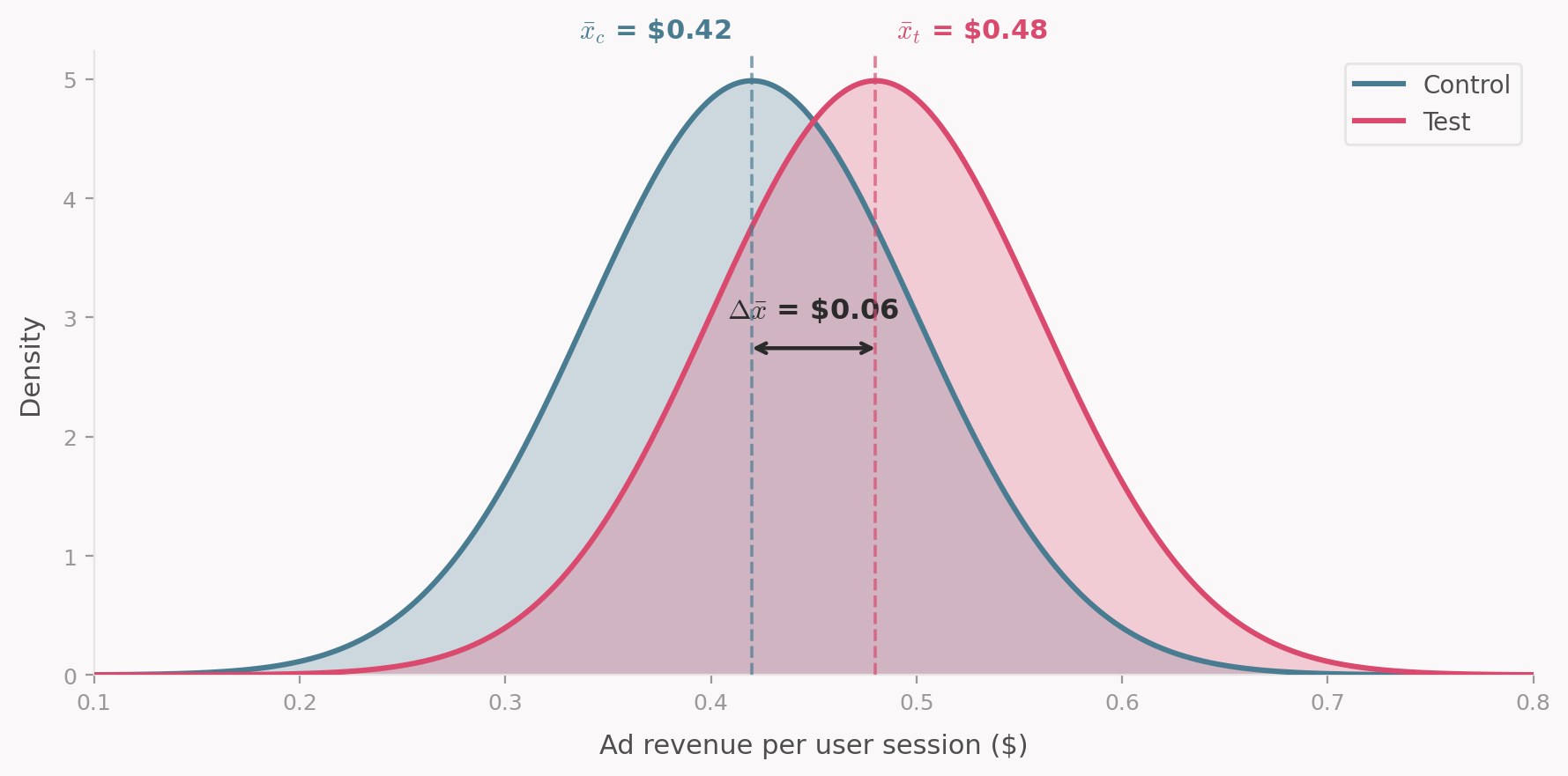Throughout this section, we’ll use the terms test (the group receiving the new treatment) and control (the group receiving the baseline or existing treatment) consistently.